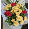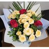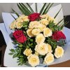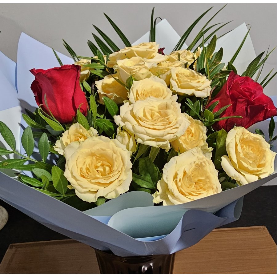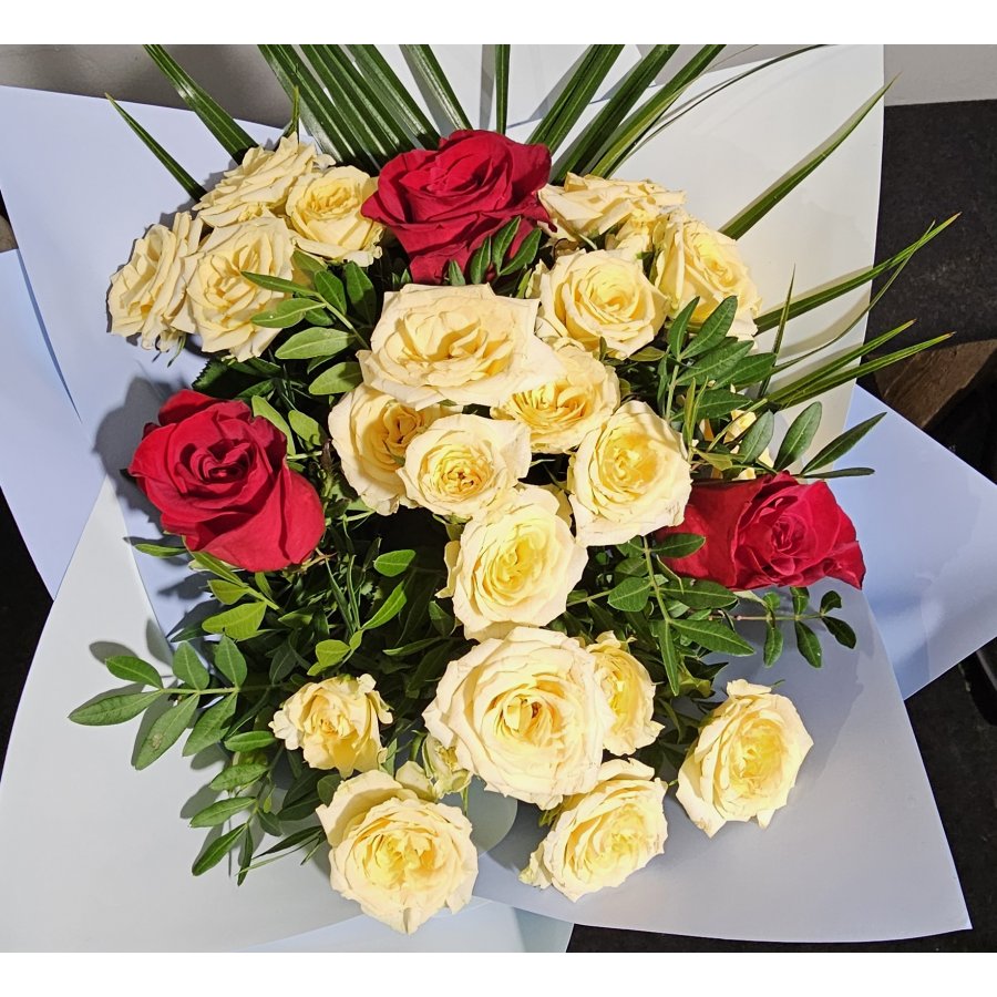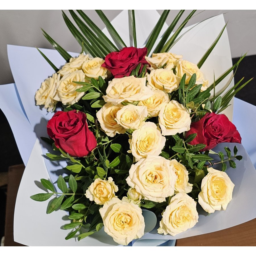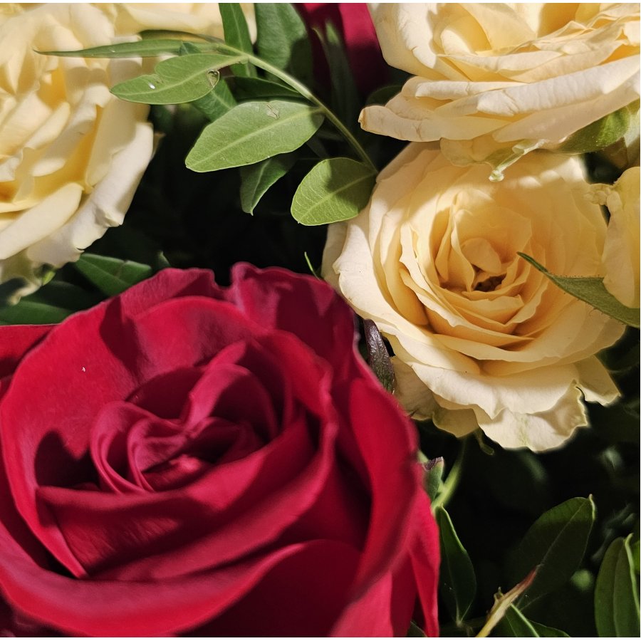 Un buchet elegant și plin de contrast, ce îmbină delicatețea trandafirilor crem cu pasiunea trandafirilor roșii. „Golden Romance” este alegerea perfectă pentru declarații de dragoste, aniversări sau momente speciale în care vrei să transmiți emoție și rafinament.