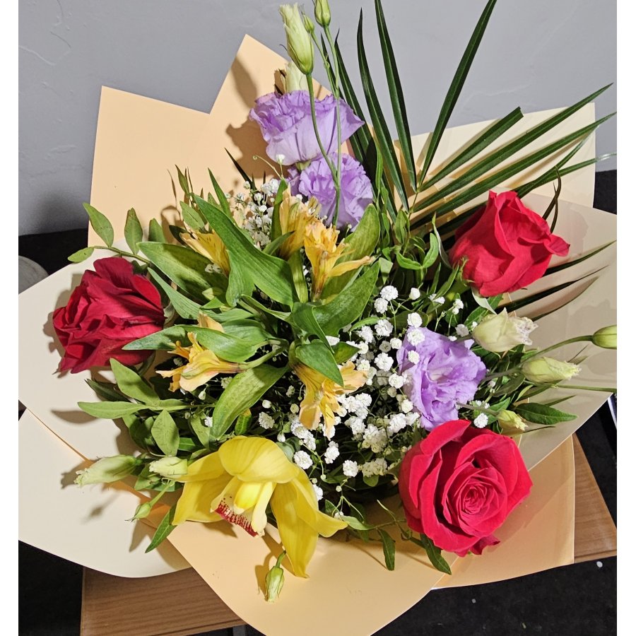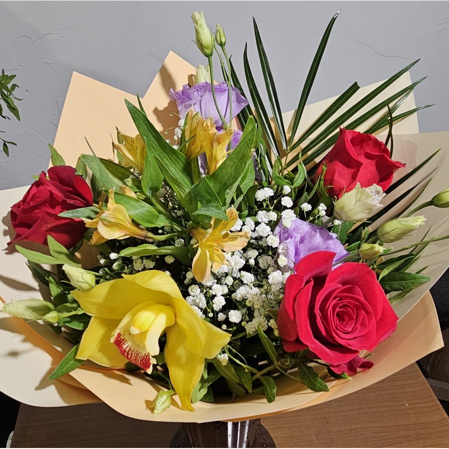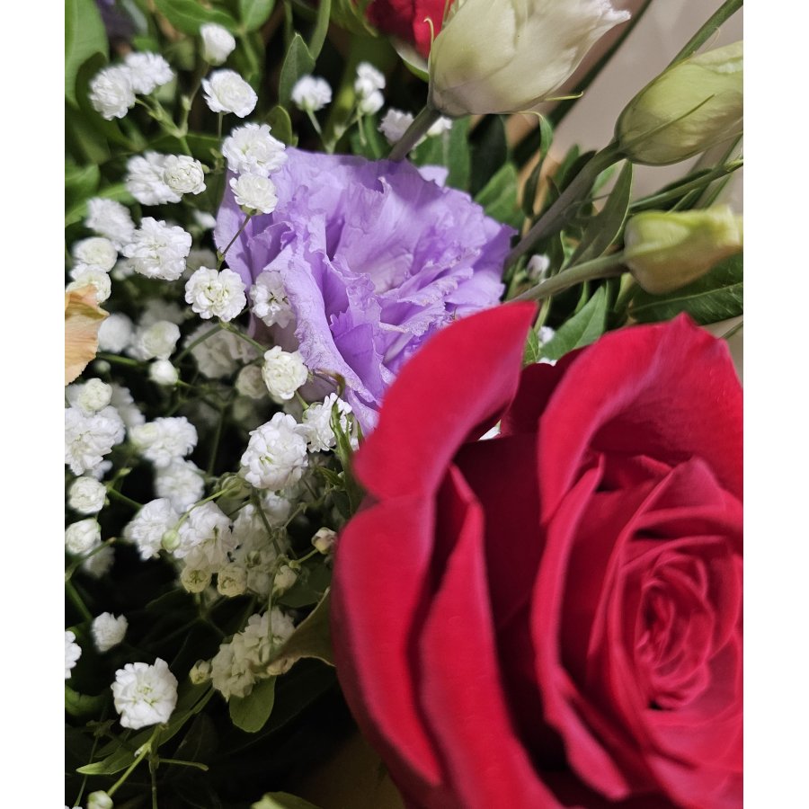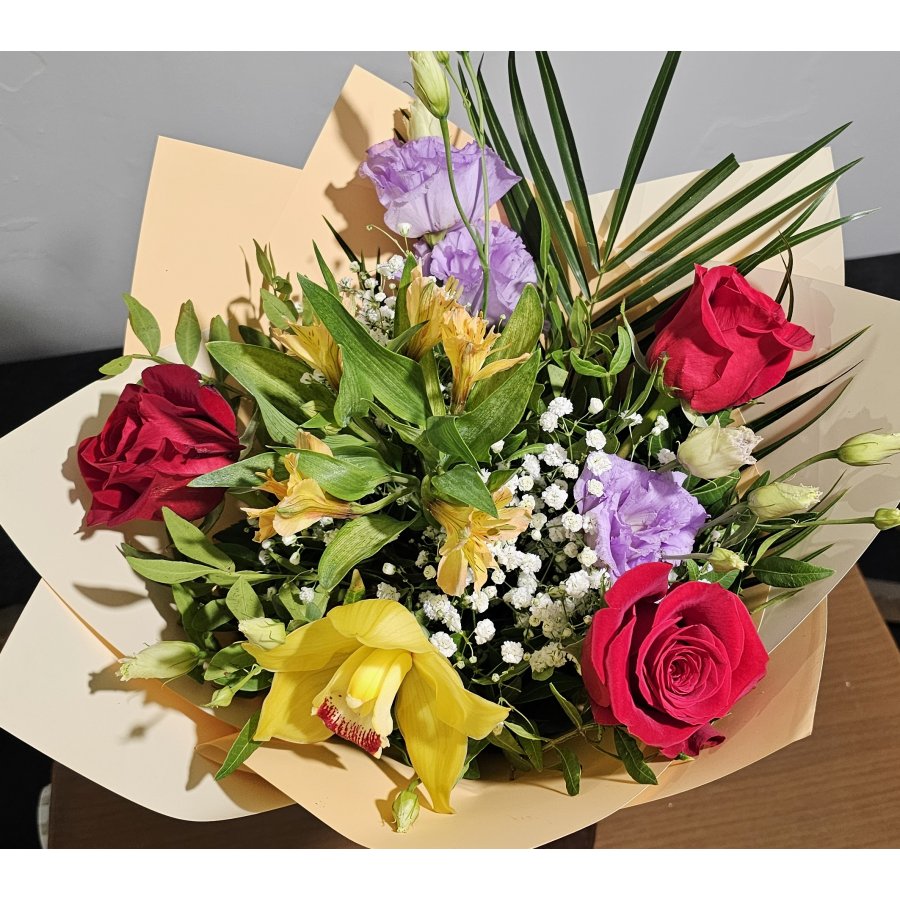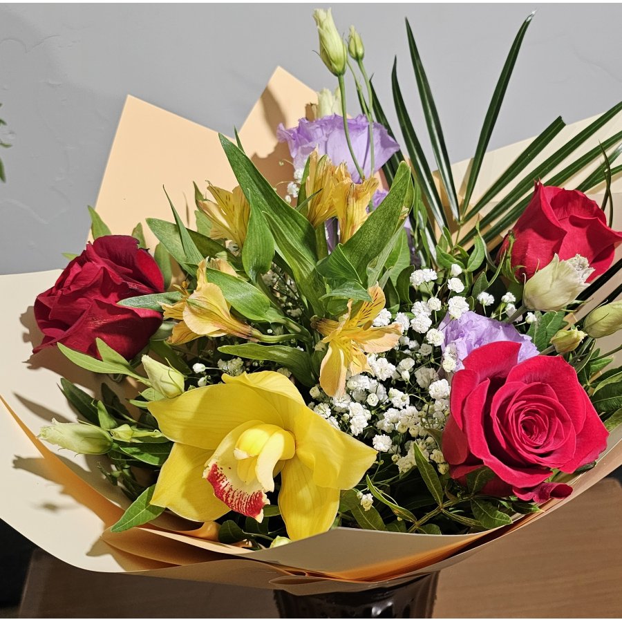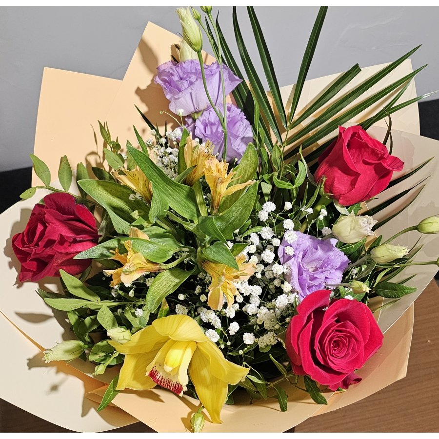 Un buchet sofisticat și vibrant, ce îmbină pasiunea trandafirilor roșii cu delicatețea lisianthusului mov și eleganța orhideei galbene. „Royal Garden” este alegerea ideală pentru ocazii speciale, aniversări sau momente în care vrei să impresionezi prin culoare și rafinament.