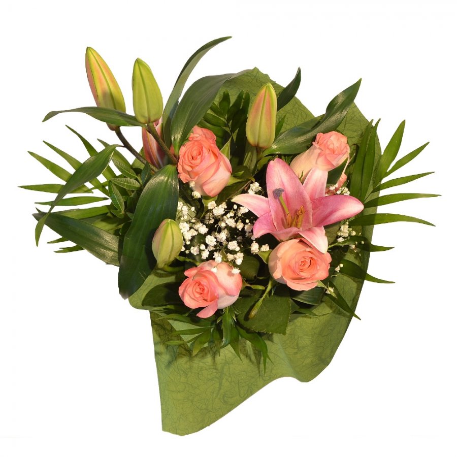 Buchet mixt trandafir cu crin roz
