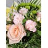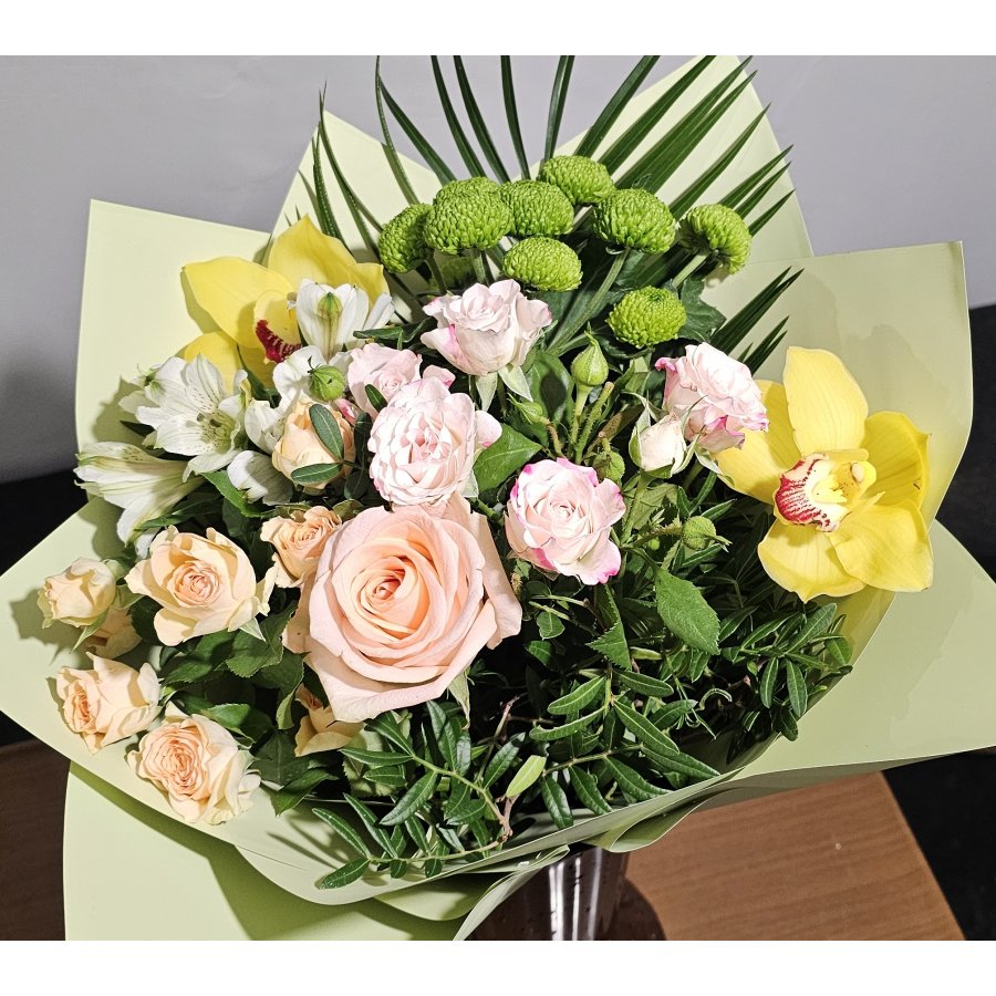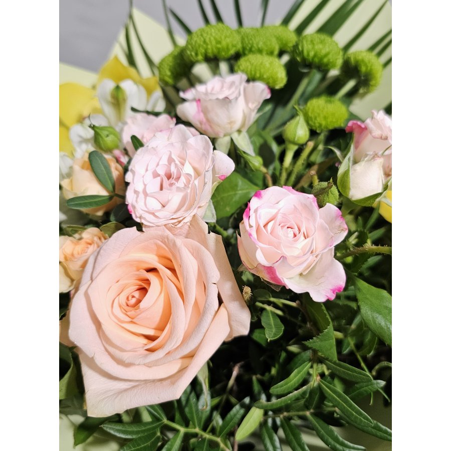 Un aranjament floral rafinat în nuanțe calde și naturale, ce combină delicatețea trandafirilor pastel cu exotismul orhideei. Ideal pentru a impresiona prin finețe și bun gust.