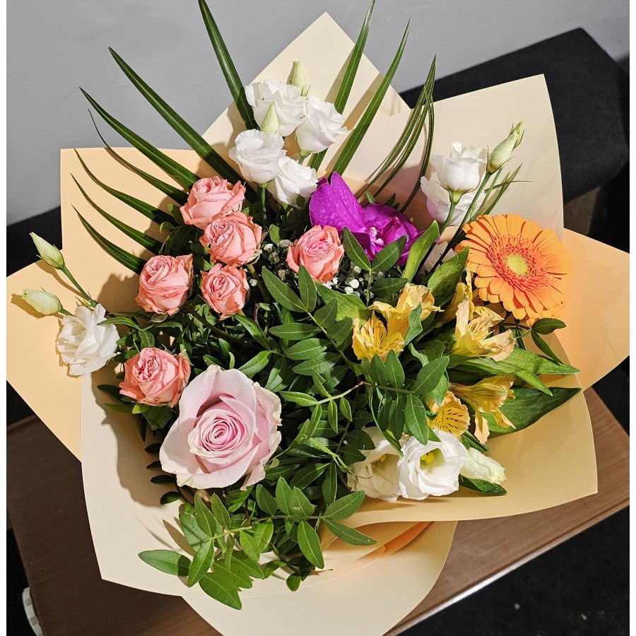 Aranjamentul este echilibrat cromatic – roz pastel, alb pur, galben solar și accente exotice – ambalat elegant în hârtie premium în tonuri calde.