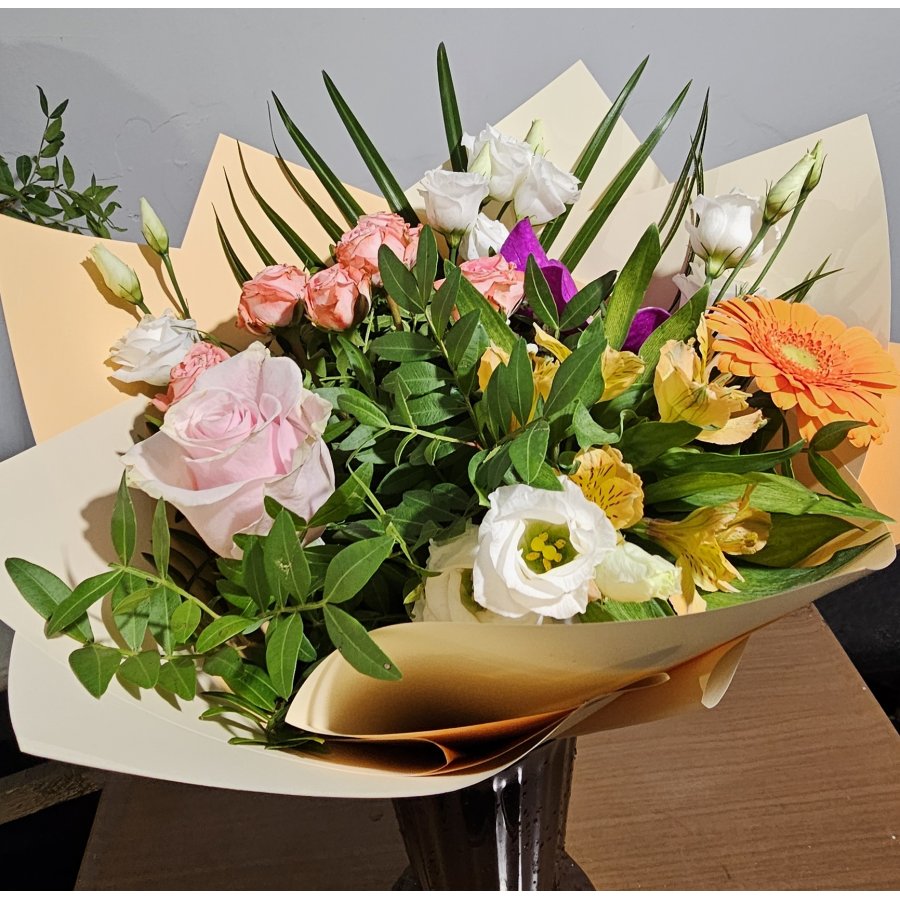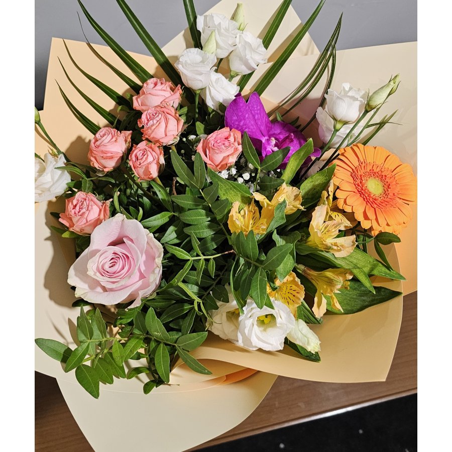 Un buchet delicat și luminos, care combină romantismul trandafirilor roz cu prospețimea florilor albe și energia vibrantă a gerberei portocalii. „Peach Delight” este alegerea ideală pentru a transmite bucurie, recunoștință și căldură.
