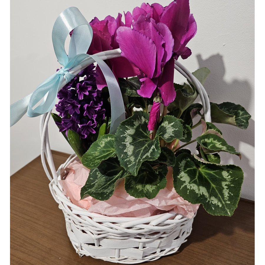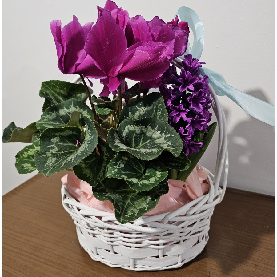 Un aranjament delicat și elegant, perfect pentru a aduce culoare și prospețime în orice încăpere. „Sweet Bloom Basket” combină farmecul ciclamenului roz intens cu parfumul zambilei mov, într-un coș decorativ alb, accesorizat cu fundă satinată bleu.