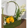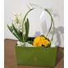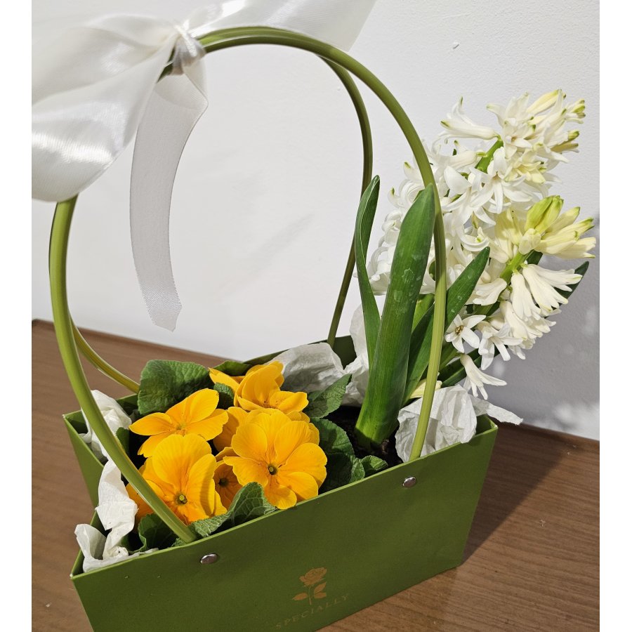 Un aranjament elegant și luminos, ce îmbină delicatețea zambilei albe cu energia caldă a primulei galbene. Așezat într-o cutie decorativă verde cu mâner și fundă albă satinată, „White Spring Glow” este cadoul perfect pentru a transmite prospețime, optimism și rafinament.